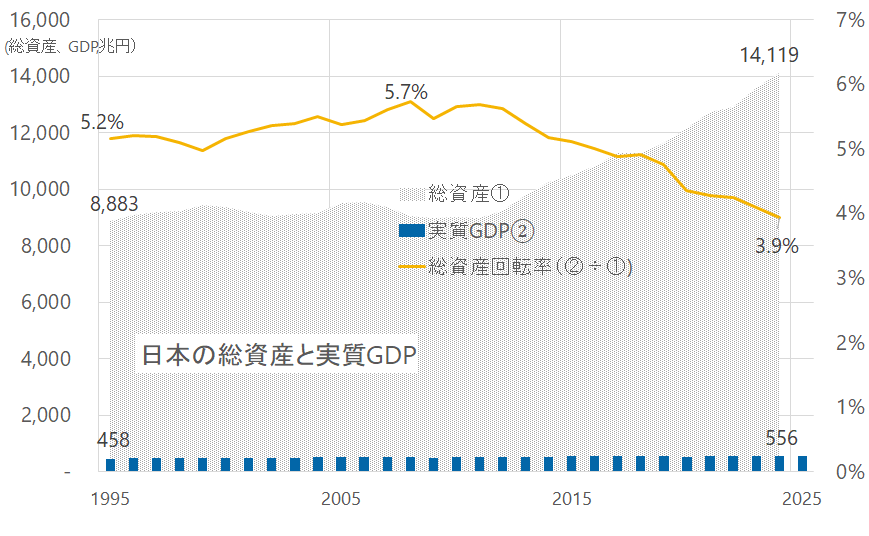 1995年は8,883兆円①。実質GDPは458兆円②でした。②÷①を総資産回転率と呼びましょう。当時は5.2%でした。