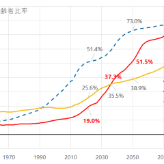 それが1990年あたりからグングン速度を上げていきます。2016年には、高齢者比率が47%に上がり、スピードは時速144キロに上がりました。高速道路でも警官に捕まる速さです。よく日本の社会がもったなというスピードでした。