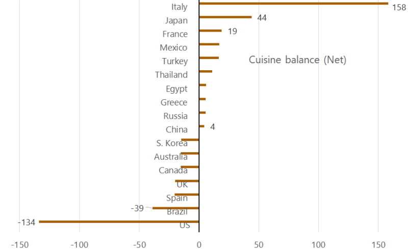 世界中、どこに行ってもピザとパスタはあるので、イタリアが1位は納得です。ただ、これほどブッチギリなのは意外でした。相手国を見ると、南米が多いですね。言語、文化が近いと、食を受け入れるというのは納得です。