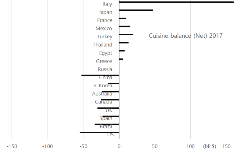- 主要な輸出国と輸入国: 映画や音楽などのオーディオビジュアル製品の貿易では、アングロアメリカの国々が支配的な輸出国であることが多いですが、料理の貿易ではそうではありません。料理の純輸出額が大きい国はイタリア、日本、メキシコであり、一方、米国は最大の純輸入国です。このパターンは、オーディオビジュアル製品の貿易パターンとは対照的です。