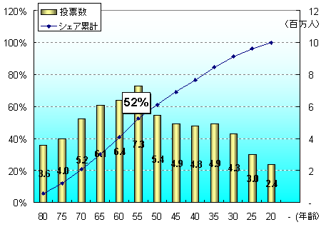 19歳以下は、選挙権がないのでゼロ。投票数が一番多いのは、55~59歳ですね。年代別のシェアを累計した数字を見ると、55歳以上で、52%となり過半数。若い人は、人数が少ないのに加えて投票率が低いので、こういう結果になるのですね。