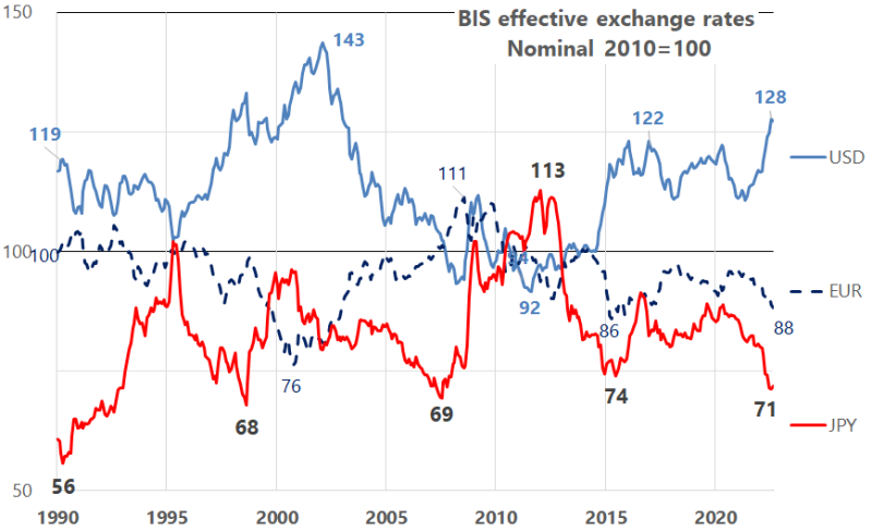 日本円の過去3回の下げ相場は、短期間で切り返してますね。今回も、これだけゼロ金利を続けて2年半も鎖国すれば、円買い需要がなくなって当たり前です。ようやく国境が開き、外国人が日本に戻ってきていますので、安すぎの日本に気づいてくれることでしょう。黒田総裁が任期いっぱい低金利を維持するとすれば、反転の契機は外国人経営者の日本企業(資産)買収になるのではないでしょうか。