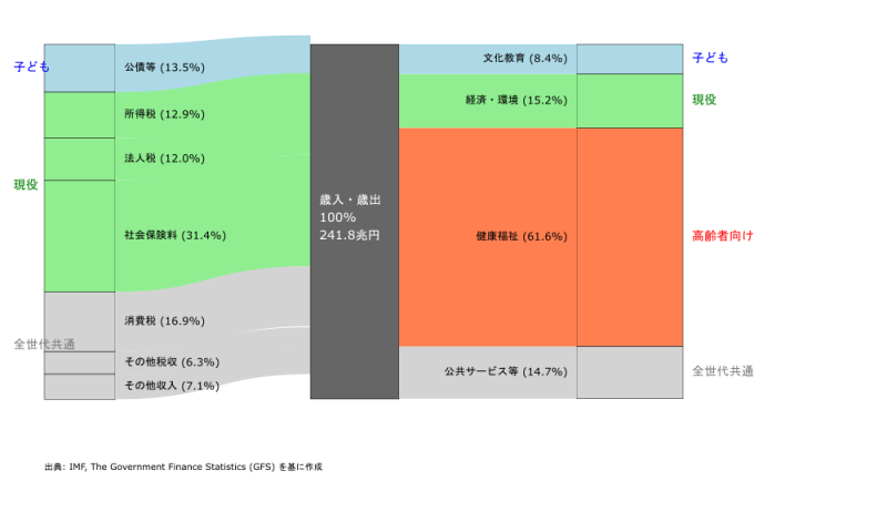 歳入ですが、公社債は、子孫が払うと仮定。所得税、法人税、社会保険料は現役が払う。消費税などは全世代が払うと考えました。