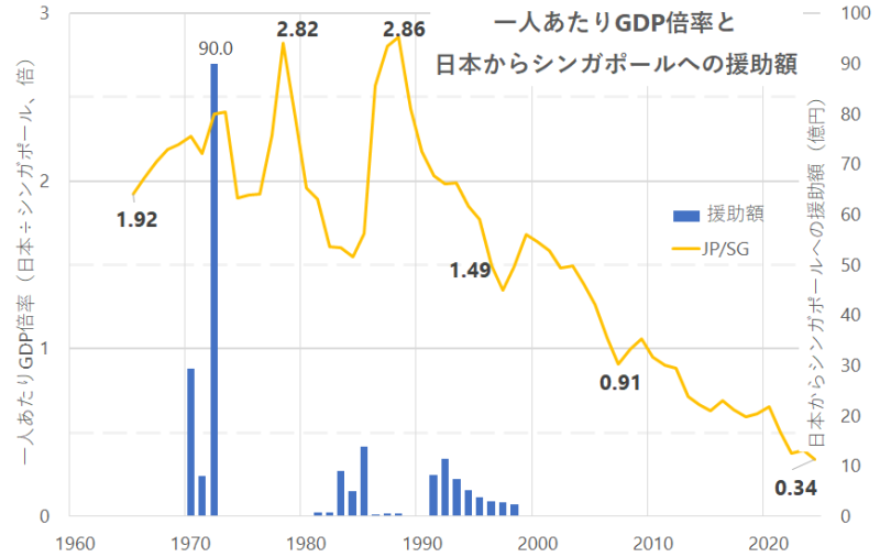 日本からシンガポールへの政府開発援助(無償+有償+技術援助)は1972年には、90億円にもなった(AIに聞いた数字で確認してません)。その後、シンガポールは発展し、1996年には、日本との一人あたりGDP倍率は1.49まで縮小。OECD開発援助委員会リスト・パートIIとなり、政府開発援助の対象国から卒業した。
