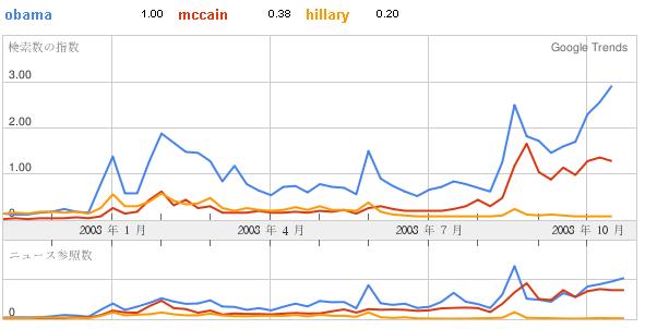 ヒラリー候補は、予備選撤退以降失速。マケイン候補の検索数が一気に伸びますが、オバマ候補がそれを上回ります。特に10月以降の検索数は、異常ですね。下段のニュース参照数では、それほど差がありません。メディアはまだ報道の公平性に配慮しているのに、一般の人の関心は素直というところでしょうか。